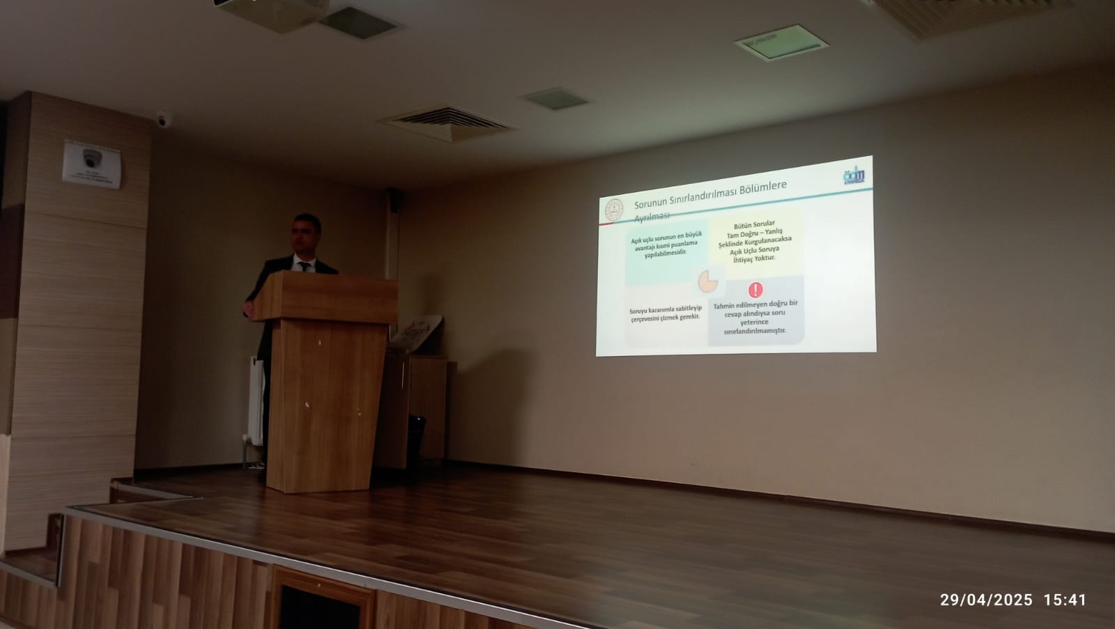 İlimiz Merkez ilçede görev yapan sınıf öğretmenlerimize yönelik "İlkokullarda Biçimlendirici Değerlendirme Yöntemleri Kursu" ile Merkez, Safranbolu ve Eflani ilçelerinde görev yapan ortaokul ve lise branşlarındaki öğretmenlerimize yönelik "Açık Uçlu Soru Yazma ve Ölçme Değerlendirme Semineri" eğitimlerimizi 28-30 Nisan 2025 tarihleri arasında kurs merkezi okullarımızda gerçekleştirdik. Safranbolu'da Şehit Murat Akdemir Anadolu İmam Hatip Lisesinde lise branşlarından 29 öğretmenimiz; Merkez ilçede 75. Yıl Anadolu Lisesinde ortaokul branşlarından 36 öğretmenimiz "Açık Uçlu Soru Yazma ve Ölçme Değerlendirme Semineri"ne katılırken; Merkez ilçede 26 sınıf öğretmenimiz Kardemir Kız Anadolu İmam Hatip Lisesinde, 29 öğretmenimiz de Şehit Metin Arslan İlkokulu kurs merkezlerinde "İlkokullarda Biçimlendirici Değerlendirme Yöntemleri Kursu"na katılmışlardır. Bakanlığımızca planlanan ve öğretmenlerimizin ölçme değerlendirme alanında yeterliliklerini artırmayı amaçlayan hizmet içi eğitim faaliyetlerimiz planlanan takvim doğrultusunda düzenlenmeye devam edecektir.